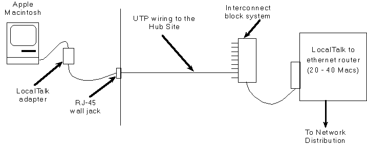 The recommended premise wiring is "unshielded twisted pair" (UTP) wire that meets the Electronic Industries Association (EIA) category 5 standards for high speed data communication service. While 2 pair cable may be adequate for most purposes, industry standards recommend installation of 4 pair cable. The difference in cost is minimal so we recommend installation of the latter. One end of each cable terminates in a category 5 RJ-45 jack located near the computer. The other end terminates on a standard "110 distribution block" at the hub site utility closet. A labeling scheme must be chosen and strictly adhered to so that cables can be identified at both ends later, as needed.