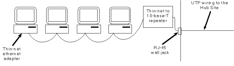 If all hub sites are within 300 cable feet of a central location, then 10-base-T wiring can be used from a central hub to connect each hub site, as shown in Figure 5. If longer distances are required, either thin-net or standard thick ethernet can be used. Fiber optic cable can be used if distance requires it and funding permits. Specific design of the "backbone" network distribution system will depend on the layout of the buildings to be served.