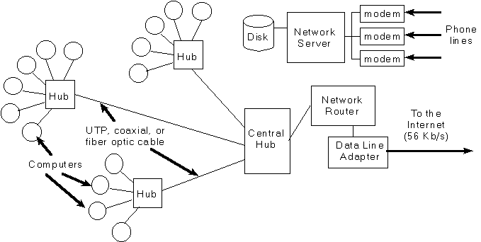 The district offices should be wired in a manner similar to a typical school, as shown above. This will allow teachers, superintendents, and principals to communicate and share information easily. In addition, an a central pool of modems could provide dial-in access to the district network.