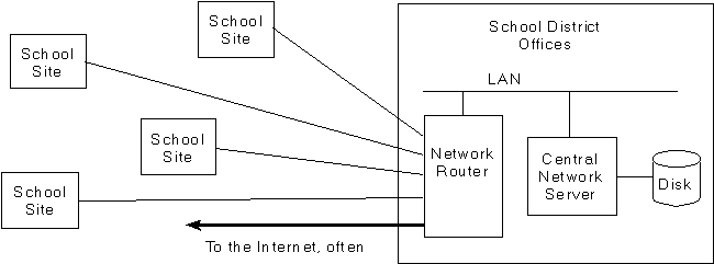 The school district offices should form the focal point for interconnection of all schools in the district. Within the District offices, network operations can be monitored and problem resolution managed. One or more network servers can provide essential network support as well as central archiving of common information and software.