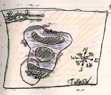 Before class the next day, the kids met at the corner of the playground to talk about the pond and the strange things that were happening. They were talking about the map that they found and all looked at it with puzzled faces. Then, in an excited voice, Derrick practically yelled, "I've got it!" Then he continued, "The 'Tu' means Tuesday! The '11p' means eleven o'clock pm! And the 's/w' means southwest!"