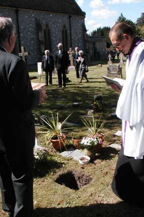On the left: Clare's husband Brian is holding the casket and the minister, Rev. Barry Conaway, is ready to say a few words. After this everyone retired to Milford Hall Hotel for a full meal reception much enjoyed by all. (No pictures worth sharing!) |